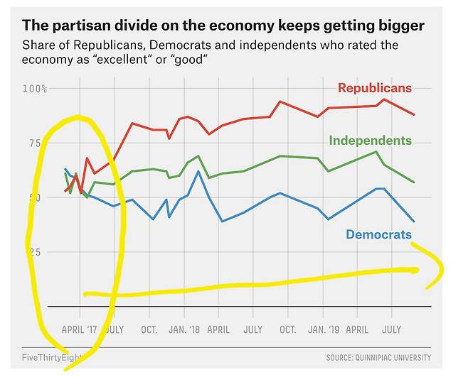 경제 상황에 대한 판단이 선거 직후부터 급격하게 좋아져서 계속 고공행진을 하는 쪽은 미국 공화당원들, 정권 교체기부터 시큰둥해서 계속 50% 안팎에서 맴도는 쪽은 미국 민주당원들입니다. 공화당원들은 지금 경제가 아주 좋다고 평가하고, 민주당원들은 경제가 그저 그렇다고 답하고 있습니다. 트럼프 기간 내내 그렇습니다.