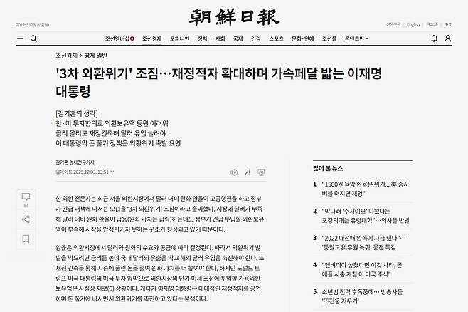 | ▲ 12월 3일 자 <조선일보 > 기사 "'3차 외환위기' 조짐…재정적자 확대하며 가속페달 밟는 이재명 대통령" |