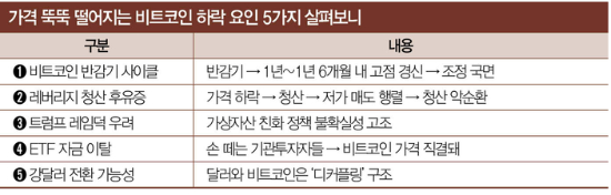 하락장의 기점을 레버리지(차입 기반 투자) 청산 사태로 보는 시선도 있다. 디지털자산 솔루션 기업 헥스트러스트의 알레시오 콰글리니 최고경영자(CEO)는 “10월 10일 비트코인 급락으로 일어난 190억달러(약 27조8000억원) 레버리지 청산 사태로 전환점이 왔다”며 “이번 조정 국면이 당분간 지속돼 7만달러대 초반까지 시험받거나 일시적으로 그 이하로 하락할 수 있다”고 말했다.