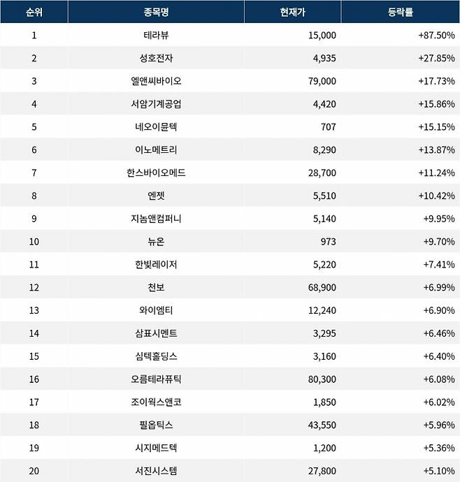 [서울데이터랩]테라뷰 87.50% 폭등…실시간 상승률 1위