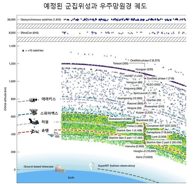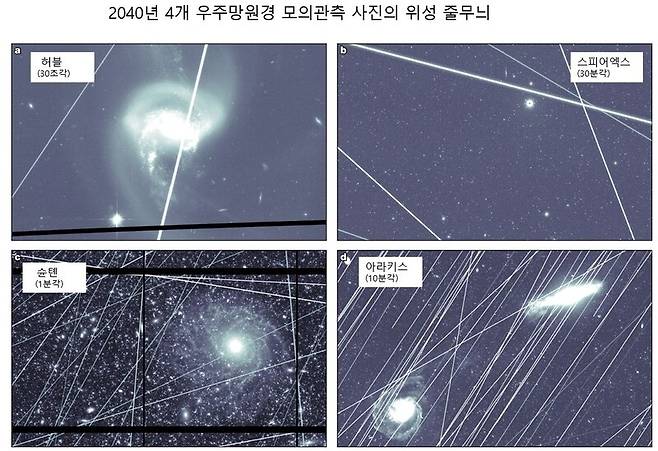 우주망원경의 큰형님 격인 허블이 그나마 영향이 가장 적었다. 고도 540km에서 활동하는 허블은 고도가 낮고 시야도 좁아 사진 한 장당 평균 2.14개의 위성 궤적이 나타날 것으로 예측됐다.