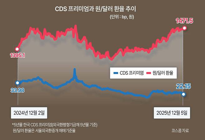 9일 금융정보업체 코스콤에 따르면, 5일 5년물 한국 CDS 프리미엄(외국환평형기금채 5년물 기준)은 22.15bp로 마감했다. 비상계엄 선포 직전인 지난해 12월 2일(33.98bp)보다도 무려 11.83bp 낮은 값이다. 계엄 이전인 작년 11월 평균치(34bp)도 크게 밑도는 수준이다.