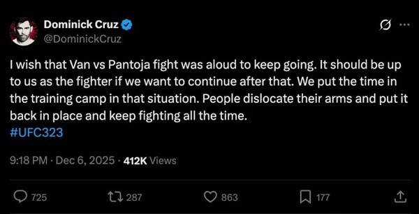 크루즈는 경기 종료 직후 X(트위터)를 통해 "판토자 vs 반 경기는 계속됐어야 한다고 본다. 파이터라면 싸울지 말지 스스로 결정해야 한다. 우리는 몇 달 동안 캠프를 준비해 왔다. 팔이 빠진 것도 다시 끼워 넣고 싸우는 사람들도 있다"라는 주장을 남겼다.