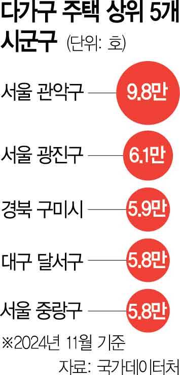 다가구주택은 1인 가구와 청년·서민층이 많이 사는 지역일수록 많았다. 시군구별로는 고시촌 등이 밀집해 있는 서울 관악구(9만8000호)가 가장 많았다. 이어 광진구(6만1000호), 경북 구미시(5만9000호), 대구 달서구(5만8000호), 중랑구(5만8000호) 등의 순이었다. 기존 주택 통계의 사각 지대에 있었던 지역 단위의 주거 현황이 자세하게 드러난 것이다.