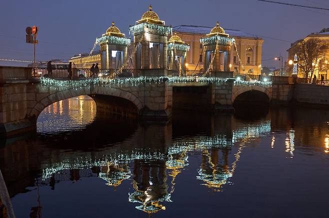 [상트페테르부르크=AP/뉴시스] 8일(현지 시간) 러시아 상트페테르부르크에서 다가오는 크리스마스와 새해 연휴를 앞두고 폰탄카강을 가로지르는 로모노소프스키 다리의 장식된 모습이 강물에 비치고 있다. 2025.12.09.