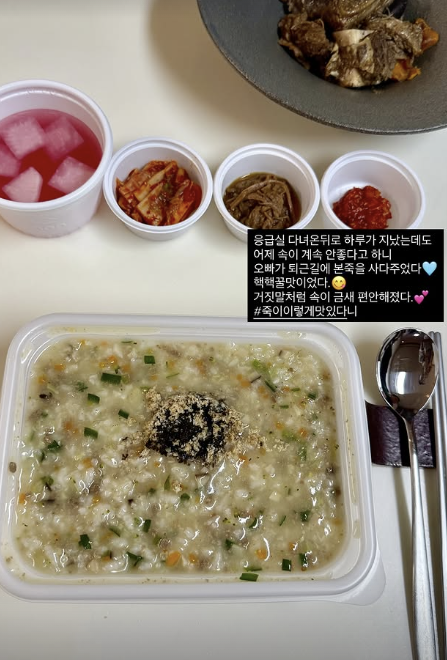 또한 그는 "응급실 다녀온 뒤로 하루가 지났는데도 어제 속이 계속 안 좋다고 하니 오빠가 퇴근길에 본죽을 사다주었다. 핵핵꿀맛이었다. 거짓말처럼 속이 금세 편안해졌다. 죽이 이렇게 맛있다니"라며 남편 윤정수 덕에 죽을 먹고 건강을 되찾았다고 밝혀 눈길을 끌었다.