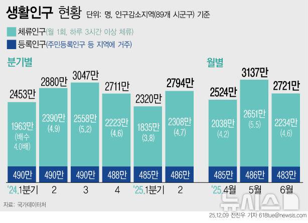 [서울=뉴시스] 9일 국가데이터처에 따르면 인구감소지역의 올해 2분기 생활인구는 평균 2794만명으로 전년보다 3.0% 감소했다. 이 가운데 체류인구는 2308만명으로, 등록인구(486만명)보다 4.7배 많은 것으로 집계됐다. 지난해 비상계엄 여파로 위축된 소비와 4월 꽃샘추위, 6월 무더위 등 계절 요인이 겹치면서 야외활동이 다소 줄어든 영향으로 풀이된다. (그래픽=전진우 기자)