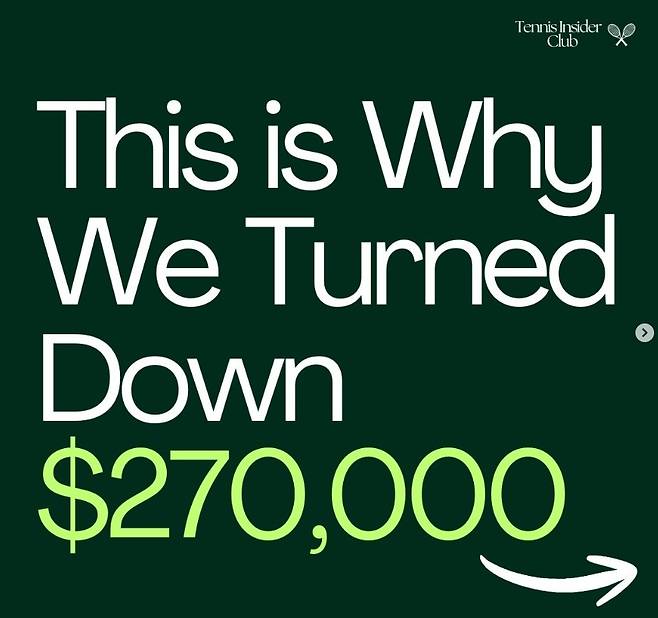 "우리의 사명은 테니스에서 사실적인 스토리를 전달하고 사람들을 고무시키며 운동선수와 팬들에게 건전한 형태로 스포츠를 성장시키는 것입니다. 베팅 머니를 받으면 그와 반대 방향으로 진행하게 됩니다. 선수들이 두려움과 갈등, 정신적 고통까지 솔직하게 이야기해주는 프로그램이고 싶다면 우리 자신이 돈보다 가치관을 중시하는 자세를 보여야 합니다. 27만달러라는 돈은 은퇴한 지 얼마 안 된 저에게도, 프로그램에도 막대하지만 장기적으로 보면 성실하고 스포츠에 도움이 되는 것을 쌓아가는 가치가 더 큽니다."