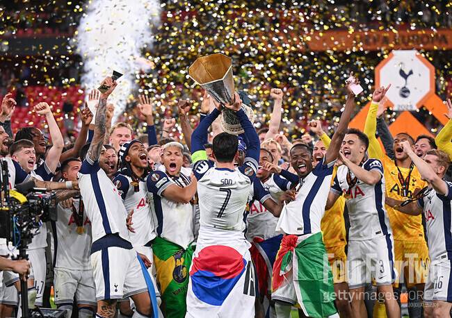 허리춤에 태극기를 두른 손흥민이 동료들을 바라보며 UEL 트로피를 들어 올리는 모습, 손흥민의 지난 시즌 공식 프로필인 ‘찰칵 세리머니’ 사진이 크게 담겨져 있었다. 그 뒤에는 한글로 ‘손흥민’ 이름이 크게 담겨 있었고, ‘SON Seven spurs legend’라는 문구도 찾아볼 수 있었다.