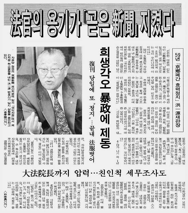 | ▲ 1993년 10월 6일 자 <경향신문> 기사 "법관의 용기가 '곧은 신문' 지켰다" |