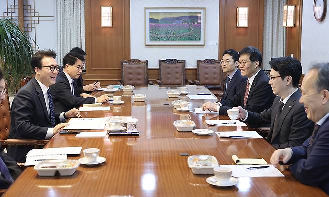 | 경제 현안 간담회 김민석 국무총리(왼쪽)가 9일 서울 종로구 정부서울청사 집무실에서 이창용 한국은행 총재(오른쪽 세 번째)와 경제현안 관련 간담회를 진행하고 있다. 김 총리는 “환율, 물가안정 등 시장 안정을 위해 한은과 정부와의 공조가 중요하다”고 말했다. 총리실 제공 |