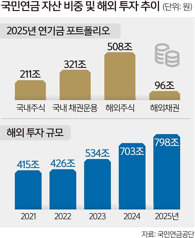 정부는 국민연금의 해외투자에 따른 외화유출 차단에 총력을 기울이고 있다. 앞서 전략적 환헤지와 외환스와프를 검토한 데 이어 외화채 발행까지 논의하고 있다. 앞서 구윤철 부총리 겸 기획재정부 장관은 “국민연금은 외환시장 내 단일 최대 플레이어”라고 언급한 바 있다. 기금운용 공시에 따르면 9월 말 기준 국민연금의 운용 자산 1361조2000억원 중 해외주식(508조2000억원)과 해외채권(96조6000억원)이 차지하는 비중은 44.4%에 달한다. 대체투자(해외투자분)까지 고려하면 전체 자산 중 절반 이상이 해외에 투자되고 있다.