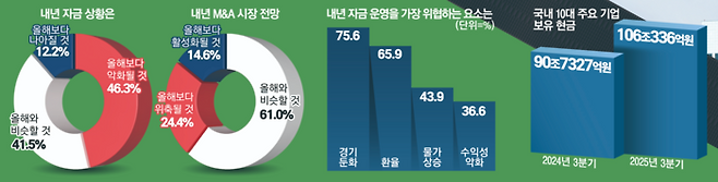 환율 변동성, 기업 규제 리스크, 경기 둔화 우려 같은 부담 요인이 여전히 해소되지 않아 방어적 재무 운용이 불가피한 분위기다.