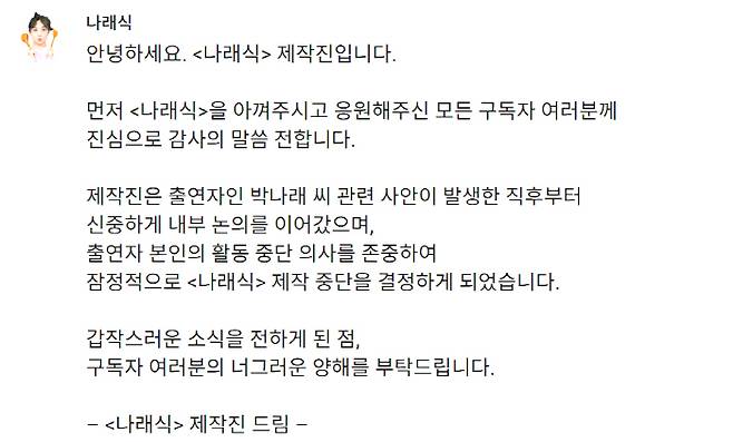 [공식]박나래 채널 '나래식'도 제작 중단 "본인 활동중단 의사 존중"(전문)