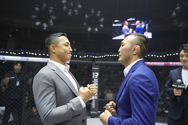 이날 로드FC는 내년 3월 15일 첫 대회에 대한 라인업을 공개했다. 지난해 12월 29일 굽네 ROAD FC 071에서 밴텀급 토너먼트 결승전을 치렀으나 버팅 반칙으로 재경기가 결정된 ‘2023 토너먼트 우승자’ 김수철(34, 로드FC 원주)과 ‘제주짱’ 양지용(29, 제주 팀더킹)의 대결이다. 두 파이터는 케이지에 올라 내년에 진행될 결승전 포부를 전했다.