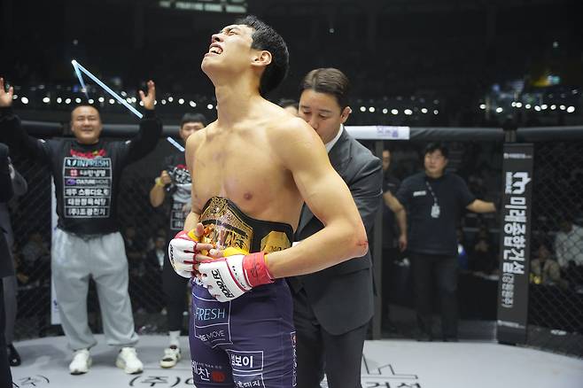 로드FC 정문홍 회장에게 챔피언 벨트를 받은 윤태영은 웰터급 초대 챔피언에 등극했다.