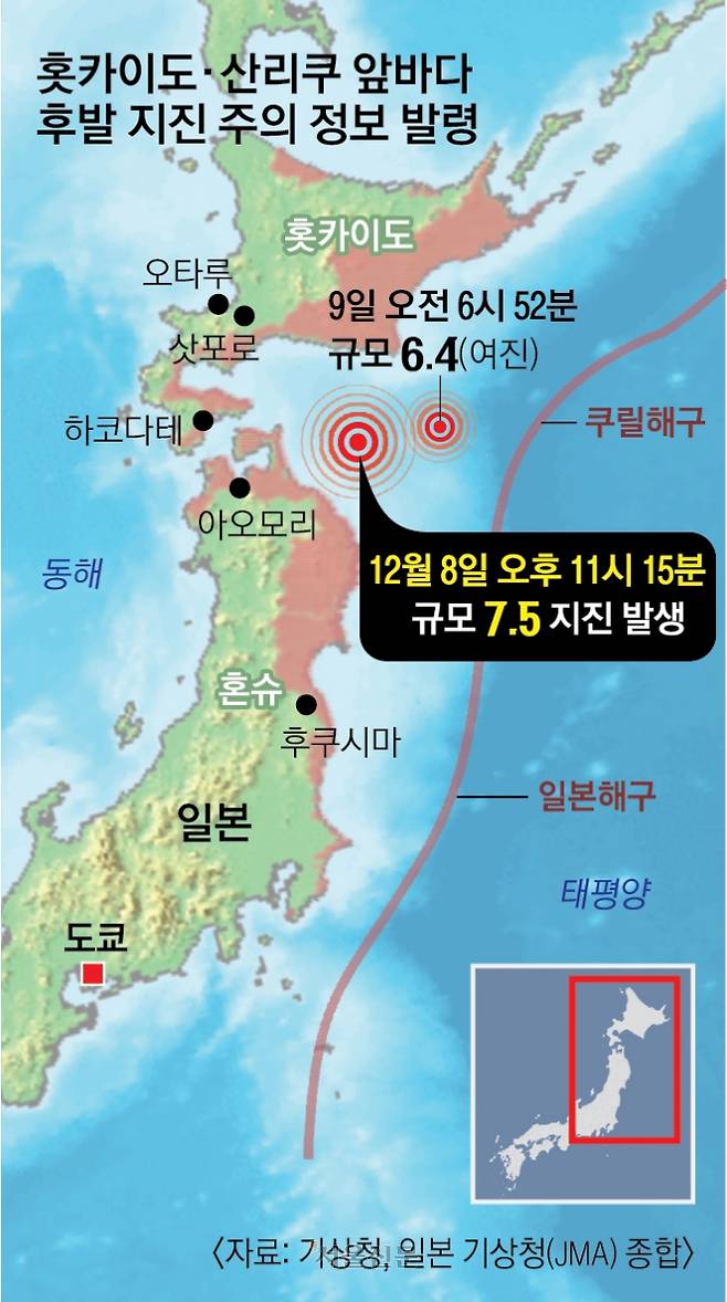 일본 기상청은 이번 지진을 계기로 ‘홋카이도·산리쿠 앞바다 후발 지진 주의 정보’를 처음으로 발령했다. 대상 지역은 홋카이도에서 아오모리, 이와테, 미야기, 후쿠시마, 이바라키, 지바현에 이르는 182개 시·정·촌에 달한다. 2022년 12월 도입된 이 제도는 일본 해구·쿠릴 해구 인근에서 규모 7.0 이상의 지진이 발생해 대형 지진 가능성이 평소보다 커졌다고 판단될 경우 발표된다.