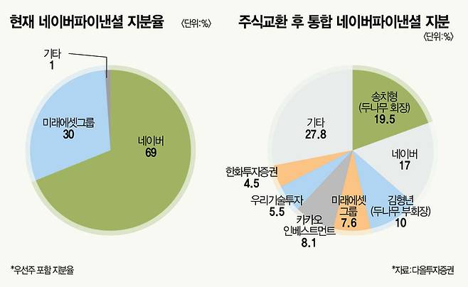 잠깐용어 *포괄적 주식교환 | 모회사-완전 자회사 구조를 목적으로 회사 간 주식을 포괄적으로 교환하는 행위다. 모회사가 될 회사(네이버파이낸셜)는 다른 회사(두나무) 주식을 모두 넘겨받는다. 이후 모회사는 자사 신주를 발행하거나 기존 보유 주식을 완전 자회사의 주주들에게 지급한다. 완전 자회사 주주들이 모회사의 새로운 주주가 되는 형태다. 사실상 합병과 유사한 효과가 발생한다.