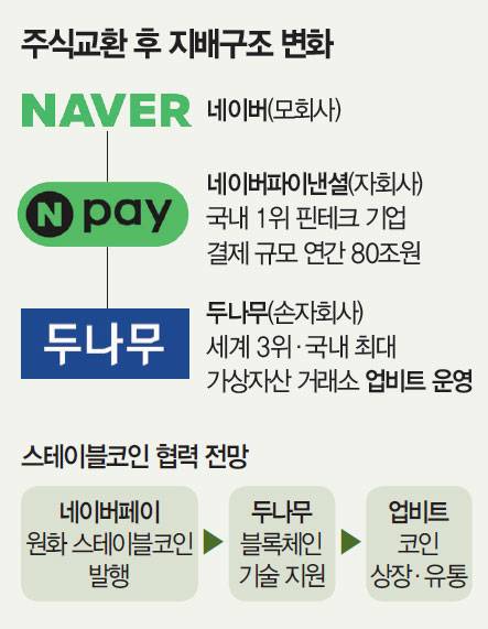 네이버 금융계열 자회사 네이버파이낸셜과 두나무가 각각 이사회를 열고 포괄적 주식교환(잠깐용어 참조)을 결의했다. 최종 마무리까지는 정부 심사와 주주총회 특별 결의가 남았다. 주주총회는 내년 5월 22일로 예정됐다. 재계는 국내 간편결제 1위 사업자와 가상자산 1위 거래소의 혈맹이란 점을 주목한다. 양 사 빅딜 배경에는 ‘내수 탈피’ 목표가 자리 잡고 있다는 분석이다. 그동안 네이버와 두나무는 ‘반쪽짜리 빅테크’에 가까웠다. 기술을 앞세워 국내 시장에선 확실한 영향력을 뽐낸 반면, 글로벌 시장에선 미미한 존재감을 보여서다. 더군다나 양 사는 최근 내수 한계가 가시화돼 변화가 필요한 시점이었다.