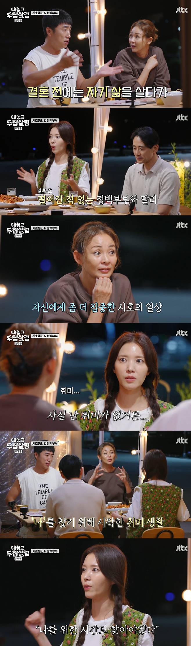 장동민은 "엄마로서의 정시아 모습을 보니 뭔가 예전보다 위축됐다는 느낌을 받았다. 그래서 내 아내도 그러겠다고 느꼈다. 결혼 전에는 자기 삶을 살았지만, 이제 아이를 키우며 사생활도 없어지지 않았나"라고 말했다. 이에 정시아는 "(야노 시 호) 언니가 추성훈 씨와 두 달간 본 적 없고 서로 자주 연락을 안 한다고 하더라. 그리고 요가랑 필라테스를 하며 지낸다고 할 때 솔직히 조금 부러웠다. 나는 솔직히 취미가 없다"라고 말했다. 이어 "내 취미는..."이라고 말하려다 결국 눈물을 보였다.