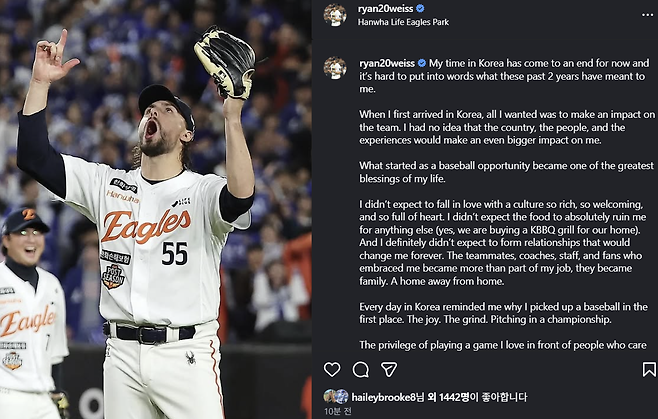 [오피셜] 한화 떠나는 와이스, 깜짝 놀랄 작별인사 "K-푸드가 날 망칠 줄 몰랐다…한국은 언제나 내 일부가 될 것"