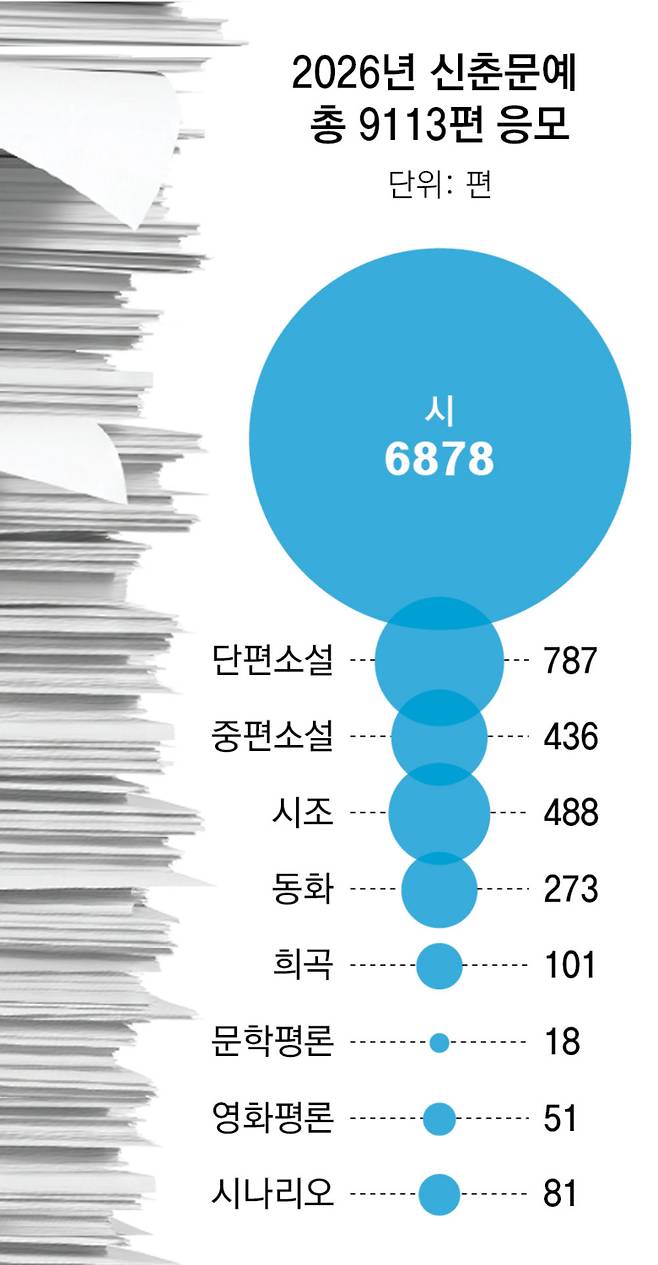 시 부문은 내면의 불안과 고립감 등 예민한 정서가 두드러진 응모작이 많았다. 서효인 시인은 “정치적 이슈는 뉴스의 과잉 때문인지 시로 가져온 경우가 드물었다”며 “시어 선택은 전반적으로 날카롭고 예민했다”고 말했다. 김상혁 시인은 “거대 담론은 사라지고 생활·주변 이야기로 이동하고 있으며, 잔잔한 우울과 불안이 응모작 전반을 관통했다”며 “응모 편수가 늘어난 것은 시에 대한 관심이 커지고 있다는 긍정적 신호”라고 평가했다.