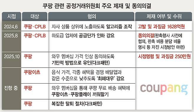 이런 납품업체 쥐어짜기와 불공정 거래 관행은 경쟁당국과의 마찰로 이어지고 있다. 쿠팡은 자체 브랜드(PB) 상품 등을 상위에 노출하도록 알고리즘을 조작하고 임직원을 동원해 후기를 작성한 혐의로 지난해 6월 공정위로부터 과징금 1628억원을 부과받았다. 현재 공정위는 쿠팡의 유료 서비스인 ‘와우 멤버십’에 쿠팡이츠와 쿠팡플레이 등 부가 서비스를 묶어 판매한 방식이 ‘끼워팔기’(묶음판매)에 해당한다고 보고, 관련 제재 절차에도 착수했다. 쿠팡의 배달앱인 쿠팡이츠는 입점업체에 음식 가격과 각종 혜택을 경쟁사와 같은 수준으로 낮추도록 하는 ‘최혜대우’를 강요했다는 혐의도 받고 있다.