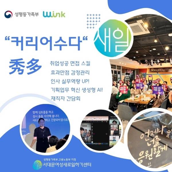 ‘커리어수다(秀多)’ 사업은 다양한 분야의 전문가, 현장 실무자, 선배 재직자와 함께 직무역량 함양, 경력유지 노하우, 취업 성공 전략 등 여성들의 직장적응 및 복귀지원을 위한 다양한 정보와 트렌드를 제공하는 사업이다.