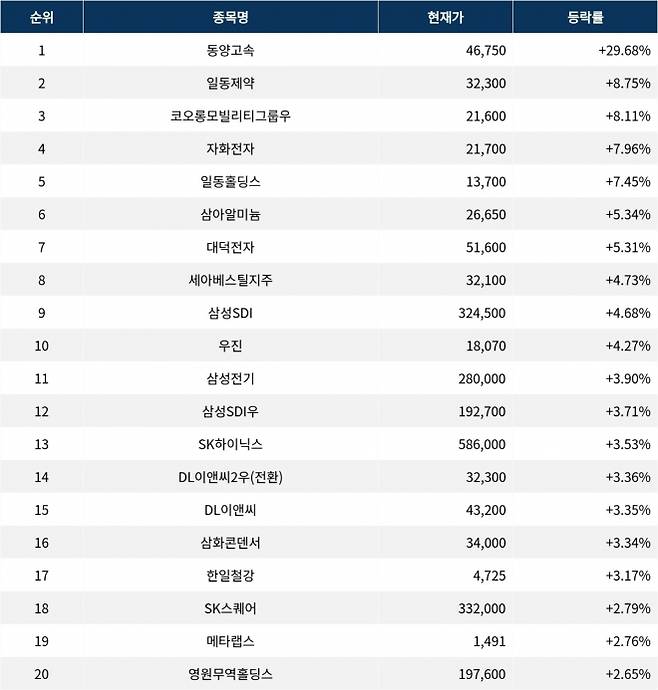 6위 삼아알미늄(006110)은 현재가 26,650원으로 5.34% 상승 중이다. 7위 대덕전자(353200)는 현재가 51,600원으로 5.31% 상승 중이다. 8위 세아베스틸지주(001430)는 현재가 32,100원으로 4.73% 상승 중이다. 9위 삼성SDI(006400)는 현재가 324,500원으로 4.68% 상승 중이다. 10위 우진(105840)은 현재가 18,070원으로 4.27% 상승 중이다.