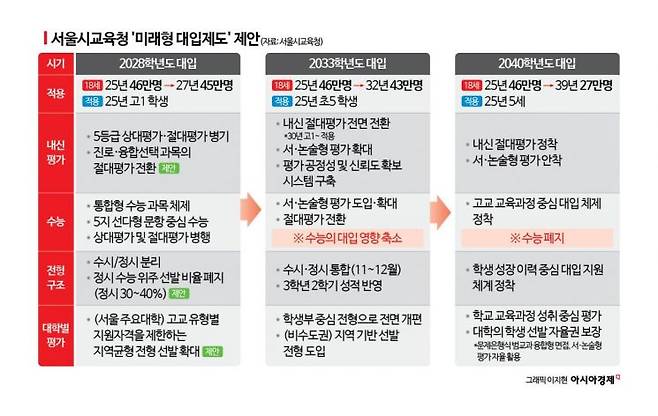 서울시교육청의 대입제도 개편 주요 내용은 ▲내신 평가 체제 개편 ▲대학수학능력시험 개편 ▲대입 전형 개선 ▲고교교육 개혁 방안이다. 특히 올해 도입된 고교학점제를 안정적으로 운영하기 위해선 현 고1에 적용되는 2028학년도 대입을 시작으로 2033학년도, 2040학년도 등 3단계에 걸친 대수술이 필요하다고 봤다.