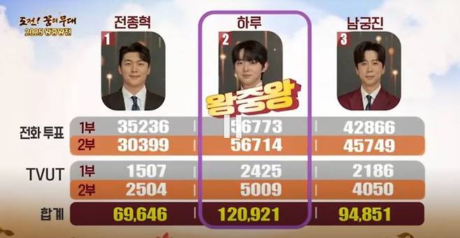 2차에 걸친 전화 투표와 TVUT(티벗) 점수 합산 최종 결과는 12만921점을 얻은 하루가 차지했다. 남궁진이 9만4851점, 전종혁은 6만9646점으로 뒤를 이었다.