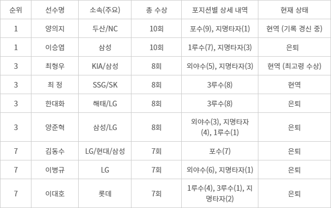 이번 시상식에서 지명타자 부문을 수상하며 통산 8회 고지에 오른 최형우(KIA)는 불혹을 훌쩍 넘긴 나이에도 건재함을 과시했다. 최정(SSG) 역시 3루수라는 고된 포지션에서 통산 8회 수상을 기록 중이다. 과거라면 은퇴를 고민했을 나이에 이들은 전성기 기량을 유지하며 한대화, 양준혁과 같은 레전드들과 어깨를 나란히 하고 있다.
