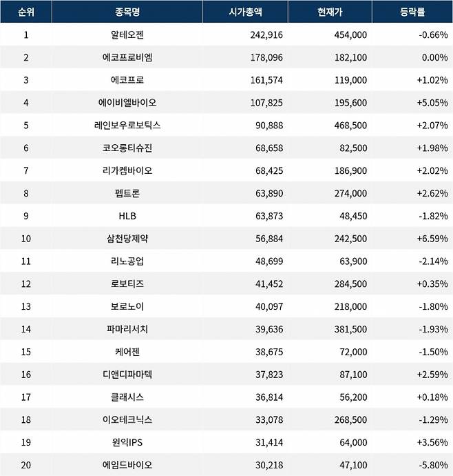 10일 한국거래소에 따르면, 시가총액 1위 알테오젠(196170)은 현재가 454,000원으로 전 거래일 대비 0.66% 하락세를 보이고 있다.