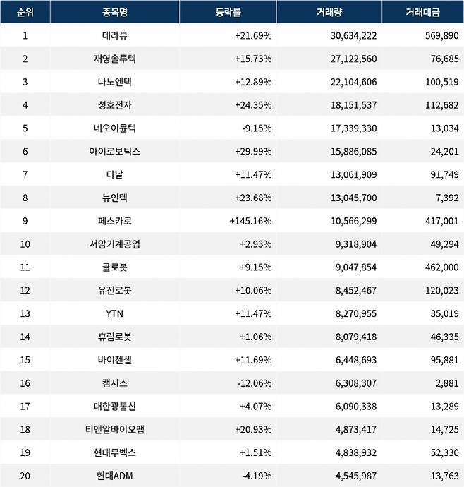 한편 거래량 상위 20위권 종목들은 클로봇(466100) ▲9.15%, 유진로봇(056080) ▲10.06%, YTN(040300) ▲11.47%, 휴림로봇(090710) ▲1.06%, 바이젠셀(308080) ▲11.69%, 캠시스(050110) ▼12.06%, 대한광통신(010170) ▲4.07%, 티앤알바이오팹(246710) ▲20.93%, 현대무벡스(319400) ▲1.51%, 현대ADM(187660) ▼4.19% 등의 성적을 기록했다.