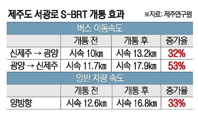 제주연구원에 따르면 서광로 BRT 구간 개통 후 2개월간 출근 시간대 버스 이동 속도를 조사한 결과 43% 향상된 것으로 분석됐다. 신제주에서 광양 방면은 시속 14.7㎞로 개통 전 10㎞보다 47%, 광양에서 신제주 방면 이동 속도는 16㎞로 개통 전 11.7㎞보다 37% 빨랐다. 버스전용차로가 아닌 일반차로에서 운행하는 차량 속도도 개통 전 12.6㎞에서 18.5㎞로 47% 향상된 것으로 나타났다. 버스 중앙차로를 피해 우회하는 차량이 늘어서라는 분석도 나오지만, 대중교통 관계자들과 이용자들은 대체적으로 만족해했다.