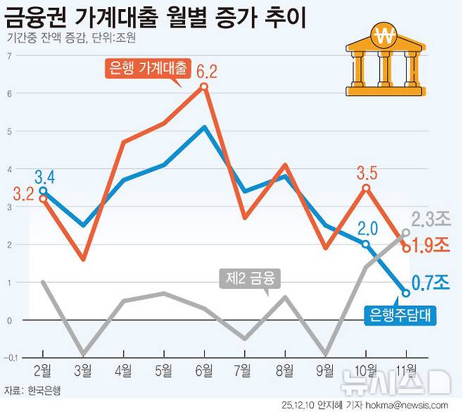 [서울=뉴시스] 지난달 은행권 가계대출은 전월보다 1조9000억원 늘어난 1175조6000억원으로 집계됐다. 전 금융권 가계대출 증가폭은 4조1000억원이다. 은행권 주담대는 2조원에서 7000억원으로 증가폭이 크게 줄었다. 제2금융권 가계대출은 2조3000억원 늘어 전월(1조4000억원) 대비 증가폭이 확대됐다. (그래픽=안지혜 기자)