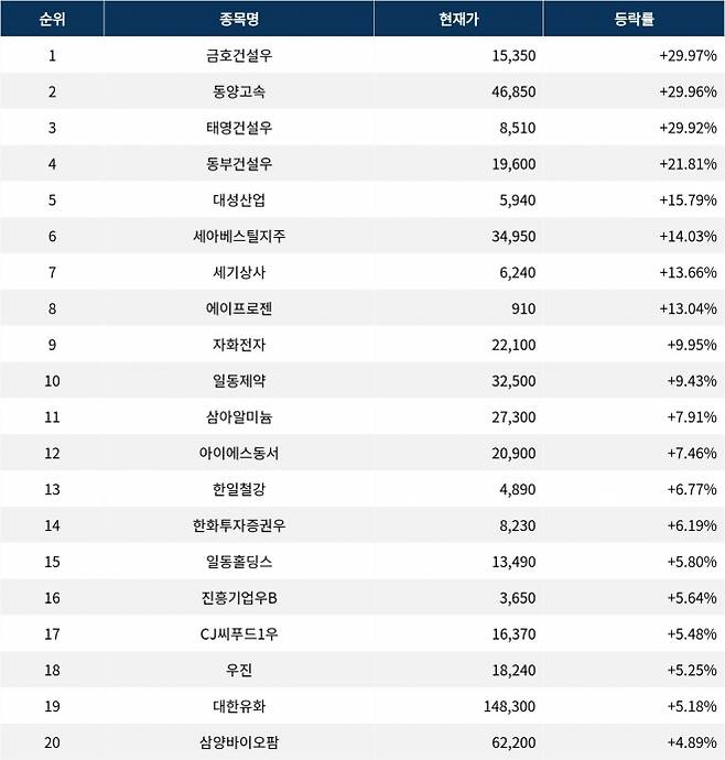 이어 상승률 2위 동양고속(084670)은 주가가 29.96% 폭등하며 종가 46,850원에 마감했다. 상승률 3위 태영건설우(009415)의 주가는 8,510원으로 29.92% 폭등하며 강세를 보였다. 상승률 4위 동부건설우(005965)는 21.81% 급등하며 19,600원에 마감했다. 상승률 5위 대성산업(128820)은 15.79%의 상승세를 타고 종가 5,940원에 마감했다.