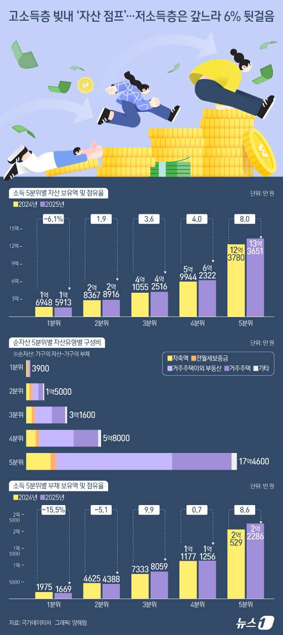 (서울=뉴스1) 양혜림 디자이너 = 지난해 부동산 시장 회복세 속에서 소득 계층 간 자산 양극화가 심화한 것으로 나타났다. 고소득층은 부채를 적극적으로 활용해 자산 규모를 늘린 반면, 저소득층은 부채와 자산이 동시에 줄어드는 '축소 균형' 현상을 보였다.