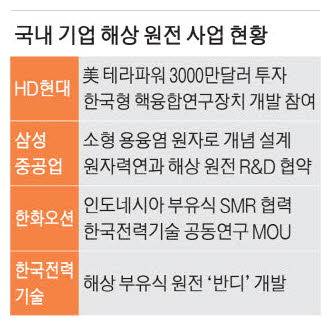 국내에서도 여러 연구기관과 기업들이 해상 원전을 개발 중이다. 한국원자력연구원은 직접 개발한 SMR 기술인 'SMART'를 기반으로 선박해양플랜트연구소와 함께 해상 원전을 개발하고 있다. 한국전력기술은 '반디'라는 이름의 해상 원전을 자체 개발 중이며 이미 상당 부분 진전을 이뤄냈다. 해양 플랜트 부문에서 세계적 경쟁력을 갖추고 있는 삼성중공업이나 한화오션 등도 해상 원전을 개발하고 있다. 국내에서 활용하기보다 수출하는 용도다. 우리나라는 국토가 작아 해상 원전이 필요할 정도의 오지가 없다. 그 대신 해상 원전은 대량으로 만들어 전 세계로 수출할 수 있으니 원전업계에서 차세대 분야로 준비하는 것이다. 섬이 많은 동남아시아 도서지역 등이 주요 시장이 될 전망이다. 업계에서는 부유식 원전에서 전력과 함께 수소나 암모니아 같은 고부가가치 물질을 생산하는 비즈니스 모델을 구상하고 있다. 현재 기술로 이런 물질을 생산하려면 많은 전력이 필요하지만, 부유식 원전에서 만들어지는 전력을 활용하면 훨씬 효율적으로 경제성을 얻을 수 있다.