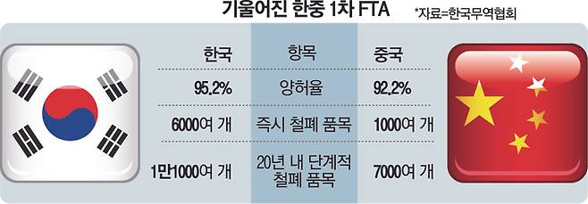 기존 1차 한중 FTA를 개선해야 한다는 지적도 나온다. 양허 품목 수와 속도 측면에서 한국보다 중국에 유리하게 협상이 체결된 측면이 있다는 것이다. 강금윤 한국무역협회 수석연구원은 “한국이 중국에 대해 관세를 매기지 않겠다고 한 품목 수는 전체의 95.2%인데, 중국이 한국 제품에 대해 양허한 비중은 92.2%로 3%포인트가량 낮다”고 말했다.