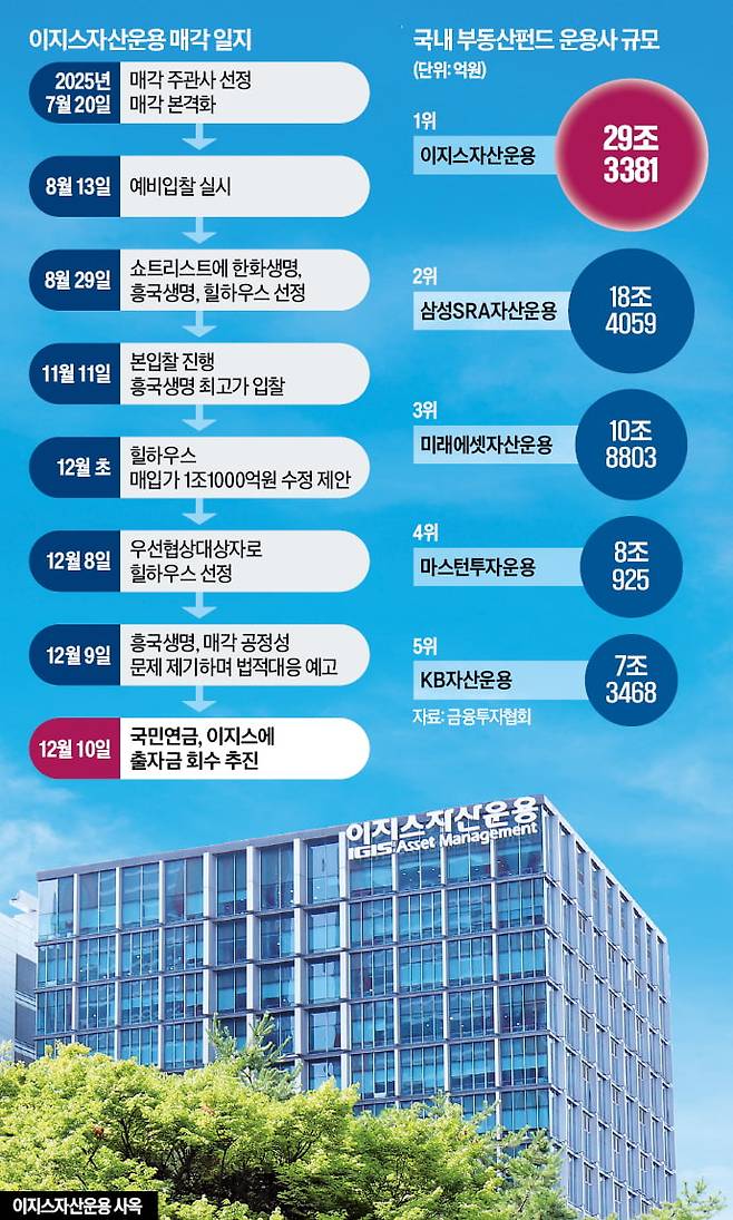 이지스운용의 경영권 매각도 불투명해졌다. 이지스운용은 본입찰을 통해 지난 8일 힐하우스를 우선협상대상자로 선정했다. 힐하우스는 1조1000억원을 제시해 한화생명과 흥국생명을 제쳤다. 하지만 국민연금 자산 7조~8조원이 빠져나가면 기업가치에 큰 변동이 생긴다. 운용자산(AUM) 축소는 기업가치 재산정으로 이어질 수밖에 없고, 거래 자체의 재협상이나 무산 가능성도 배제할 수 없다. 한 운용사 대표는 “이지스운용 딜의 기반은 국민연금 자산이었는데, 그 기반이 사라진다면 인수 구조 전반이 흔들릴 수밖에 없다”고 말했다.