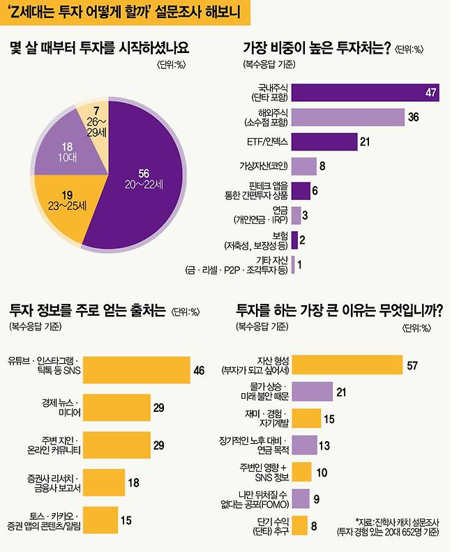 자이낸스는 다르다. 자산이 채 쌓이기도 전에 투자 정보와 플랫폼에 노출되며 입문 시점 자체가 앞당겨졌다. 매경이코노미가 진학사 캐치에 의뢰해 진행한 20대 설문조사(총 1013명)에 따르면 전체 65%에 달하는 652명 응답자가 재테크를 하고 있다고 답했다. 그중에서도 22세 미만에 첫 투자를 시작한 이가 전체 74%에 달했다. 첫 투자 나이가 20~22세라고 답한 이는 56%, 10대 시절은 18%였다. 기성세대 공식이 소득 → 저축 → 투자 순이었다면 자이낸스는 경험 → 습관 → 투자 확대 구조다