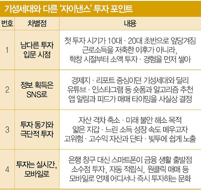 Z세대는 금융을 은행이나 증권사 창구에서 배우지 않는다. 주요 재테크 창구는 스마트폰이다. 시공간 제약 없이 언제든 즉각 투자할 준비가 돼 있다.