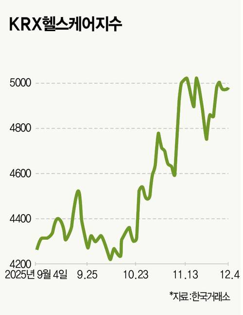 국내 주요 제약·바이오 종목 66개로 구성된 KRX헬스케어지수는 연초 3700포인트로 시작해 최근 5000선까지 치솟았다. 12월 3일 기준 올해 35% 상승했다. 상반기와 하반기 흐름은 180도 다르다. 상반기에는 4% 상승에 그쳤다. 같은 기간 코스피가 28% 올랐다는 점을 고려하면 부진한 흐름이다. 하반기 강세가 두드러진다. KRX헬스케어지수는 하반기 29% 상승했다.