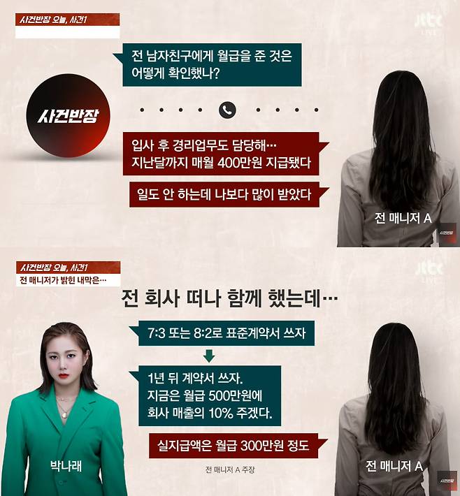 10일 JTBC '사건반장'에서는 박나래와 법적 다툼을 벌이고 있는 전 매니저와의 통화를 통해 직접 입장을 들었다.