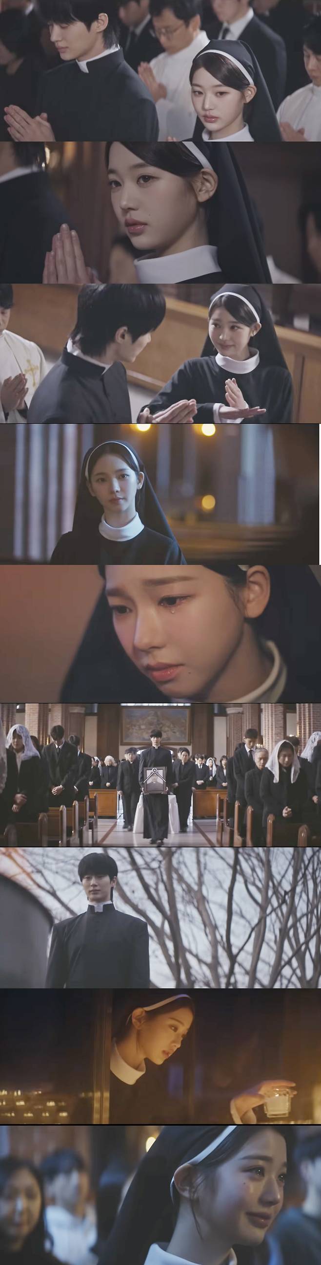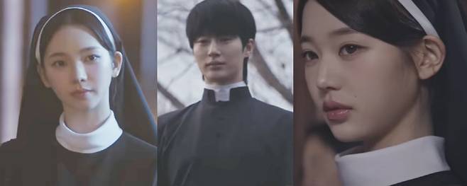 장원영과 카리나의 수녀복 비주얼도 눈부심 그 자체. 톱 K팝 아이돌로 섹시한 의상을 주로 소화하던 두 사람은 차분한 수녀복을 입고 역할에 맞는 눈물 연기까지 선보이며 훗날 본격 연기자로의 변신도 기대를 모으고 있다.