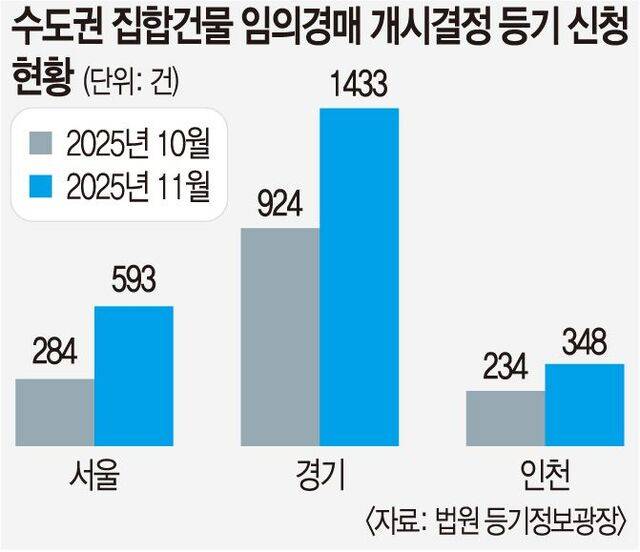 올해 1~11월 지역별로는 경기 1만5072건, 부산 6297건, 서울 5210건, 인천 3132건, 경남 2867건, 대구 1506건 등 임의경매개시결정 등기가 신청됐다. 서울은 특히 지난달 593건으로 직전 월(284건)보다 2배 이상 급증했다. 같은 기간 경기(924→1433건), 인천(234→348건)도 대폭 늘었다.