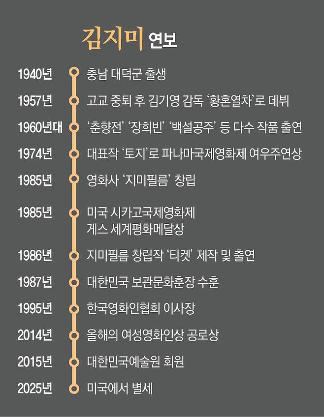 ‘한국의 리즈 테일러’ ‘원조 팜 파탈’, 1950년대부터 80년대까지 은막의 톱스타로 군림했던 배우 김지미 씨가 6일(현지 시간) 미국에서 세상을 떠난 사실이 뒤늦게 알려졌다. “영화 700편에 출연하며 700가지 인생을 살았다”는 고인은 배우로서도, 연애와 결혼으로도 언제나 세간의 화제를 모았다. “나 이상의 배우는 없단 자신감으로 살았다”는 그는 당대 ‘자유로운 신여성’으로도 평가받았다.》