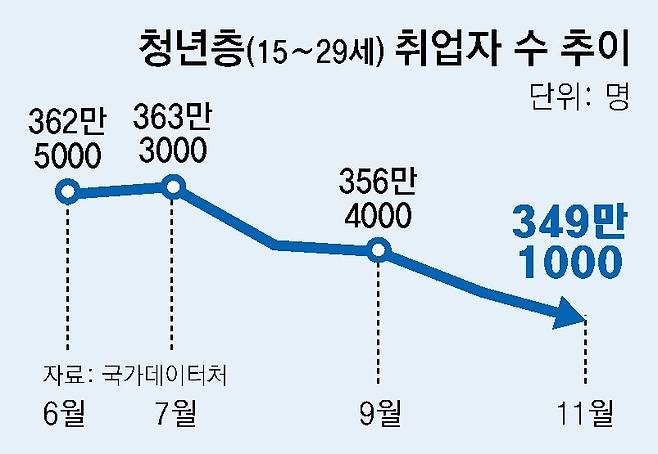 10일 국가데이터처가 발표한 ‘11월 고용동향’에 따르면 지난달 15세 이상 취업자는 2904만6000명으로 지난해보다 22만5000명 증가했다. 이 중 지난달 청년층 취업자 수는 34만9100명으로 전년보다 17만7000명 감소했다. 청년층 취업자가 전년 동월보다 감소하는 추세는 2022년 11월부터 37개월 연속 이어지고 있다. ‘청년 취업 한파’가 3년을 넘긴 셈이다. 청년 고용률도 19개월째 후퇴하고 있다.