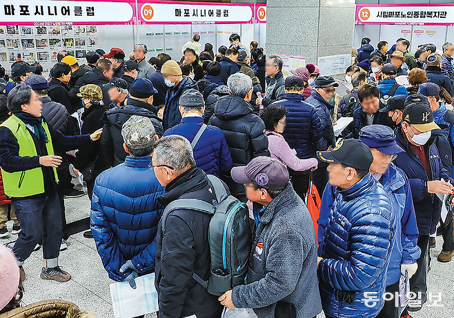 고령층 고용은 늘고 10일 마포구청에서 열린 ‘2026년 마포구 노인일자리 박람회’에서는 구직자들이 긴 줄을 서 있다. 지난달 청년층(15∼29세) 취업자 수가 줄며 37개월 연속 감소세를 보이자 ‘청년 고용 한파’ 장기화에 대한 우려가 커지고 있다. 전영한 기자 scoopjyh@donga.com